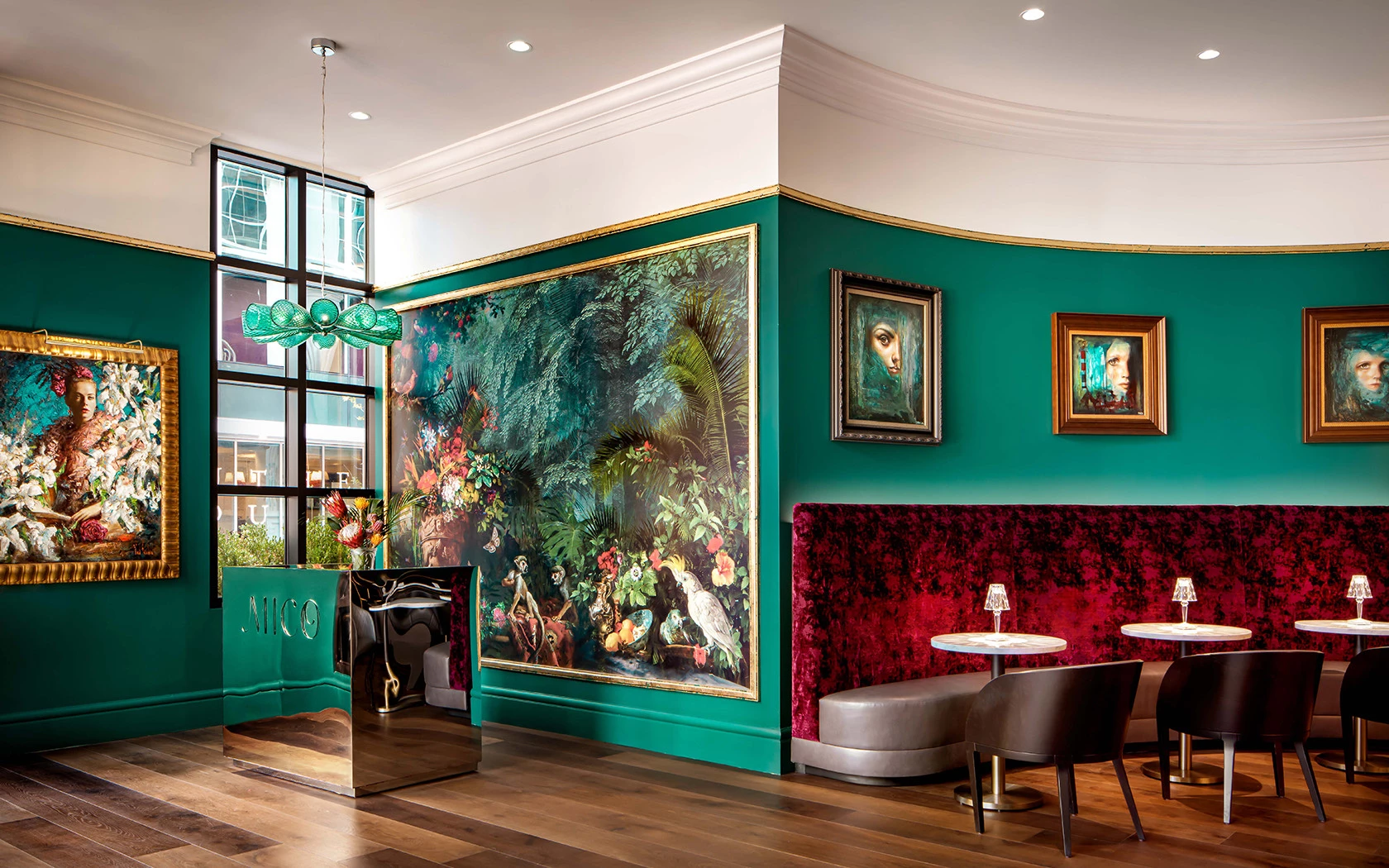 Green wall, with greenery picture frames and red velvet seating booths for dining.