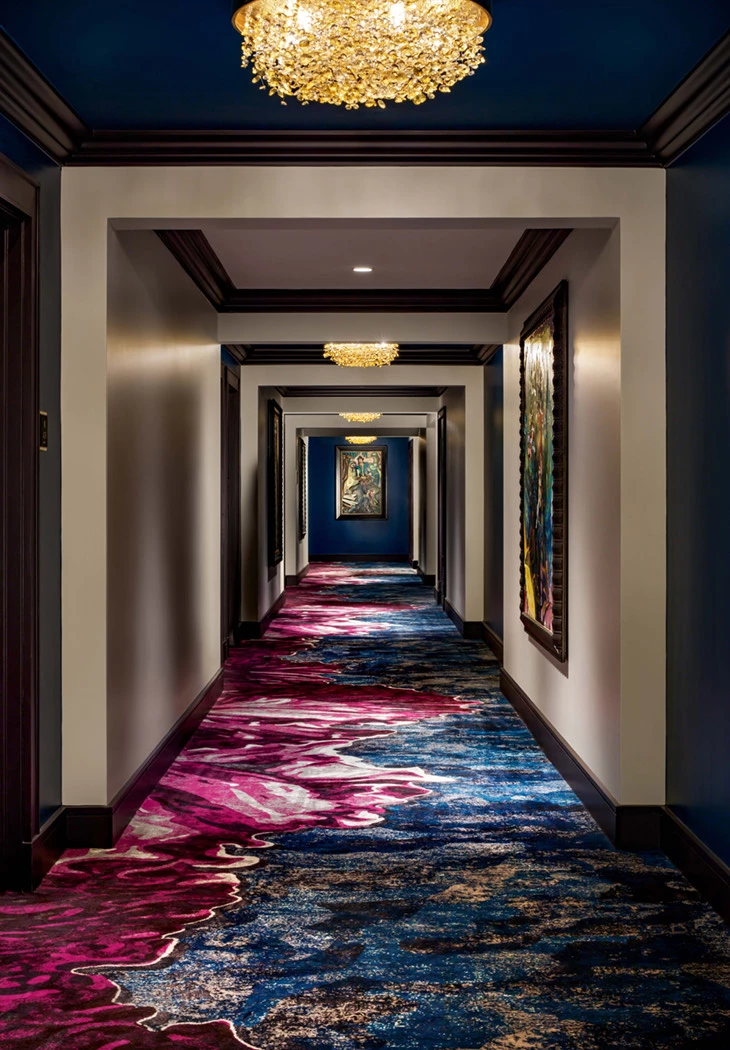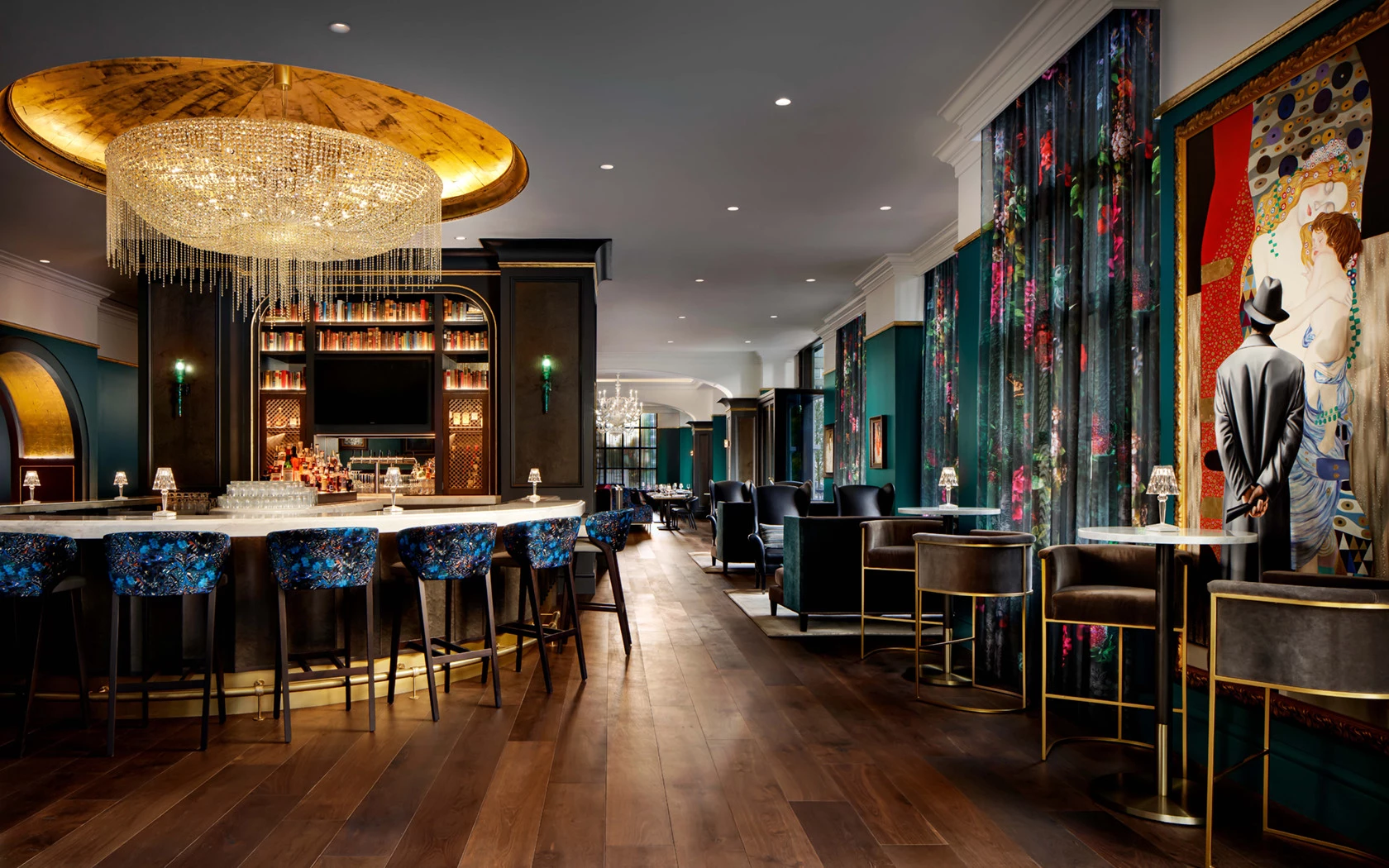 Turquoise, artsy aesthetic hotel room with mini golden table.