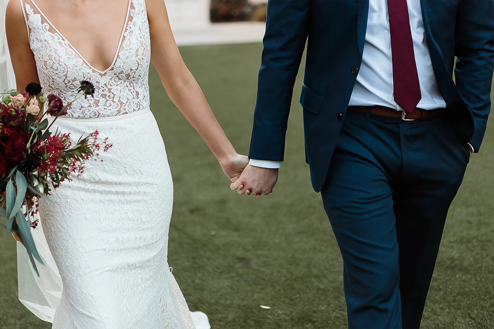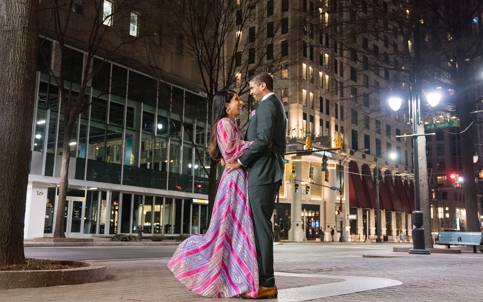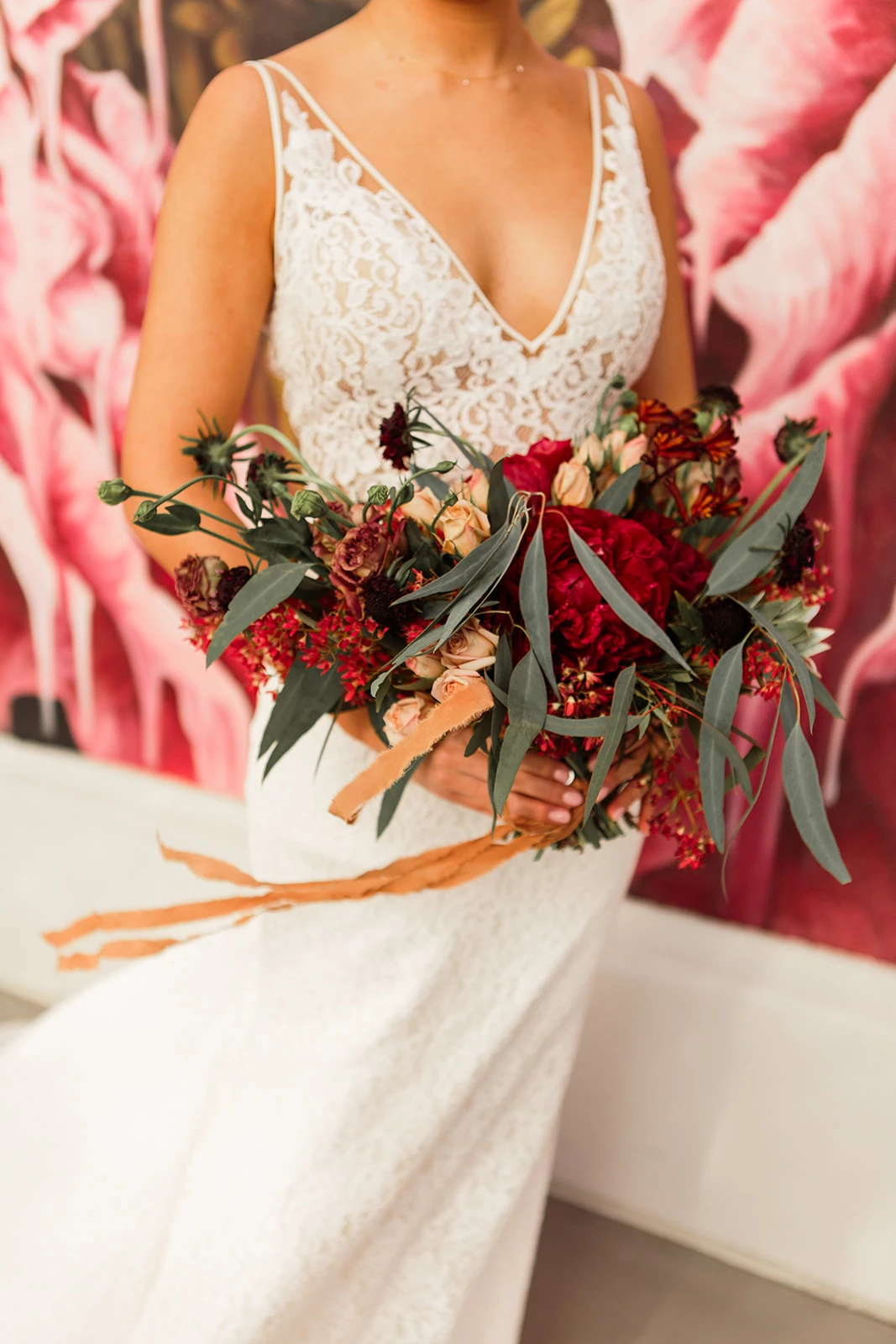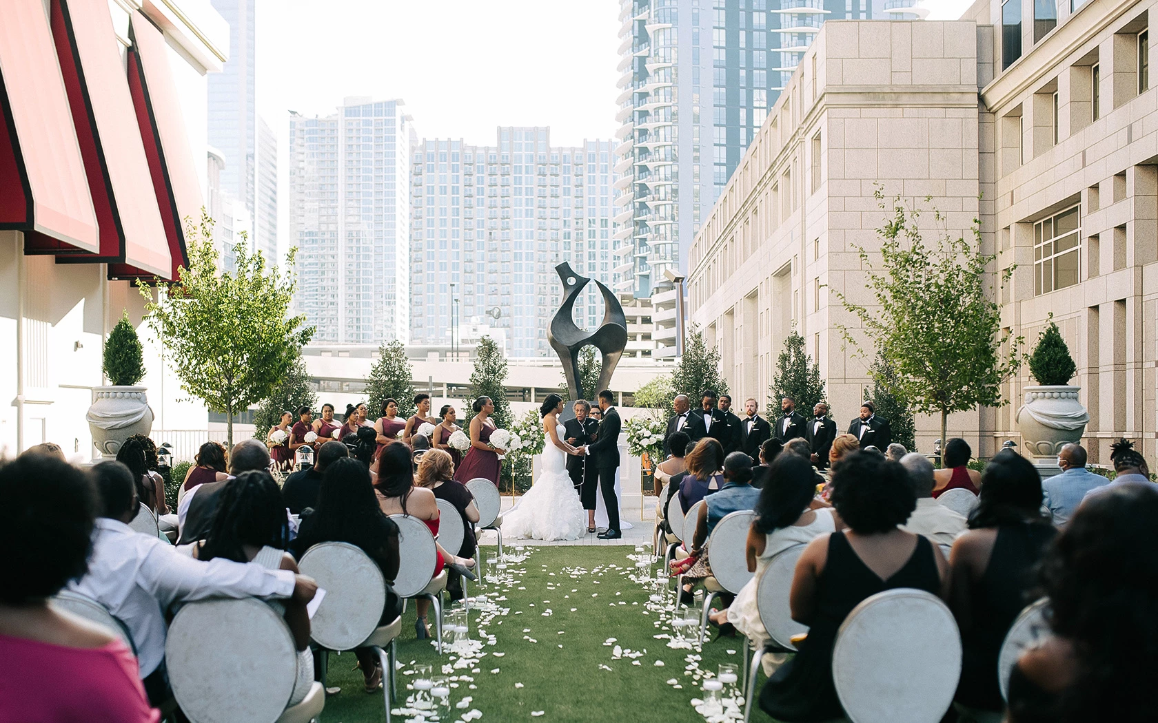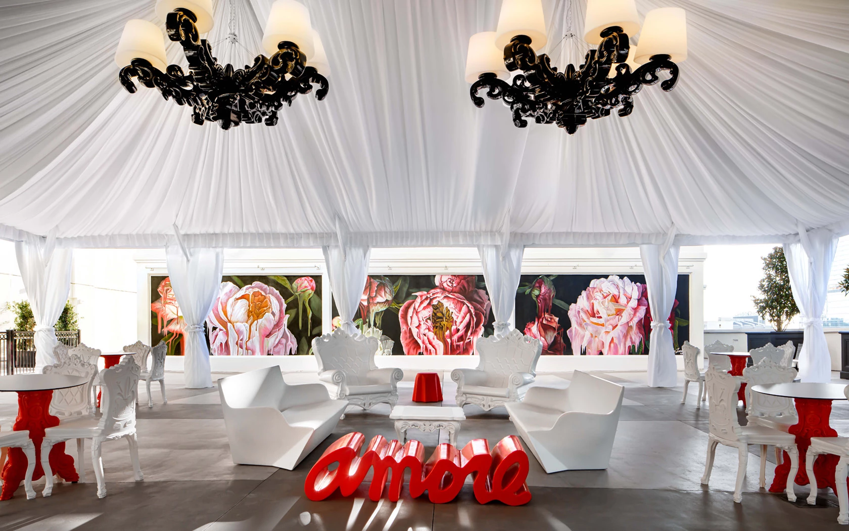 Red and white, love themed wedding reception set up on the outdoor queen terrace.