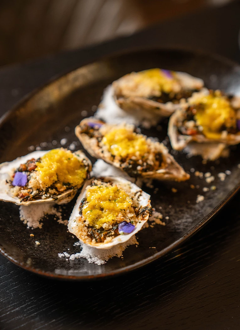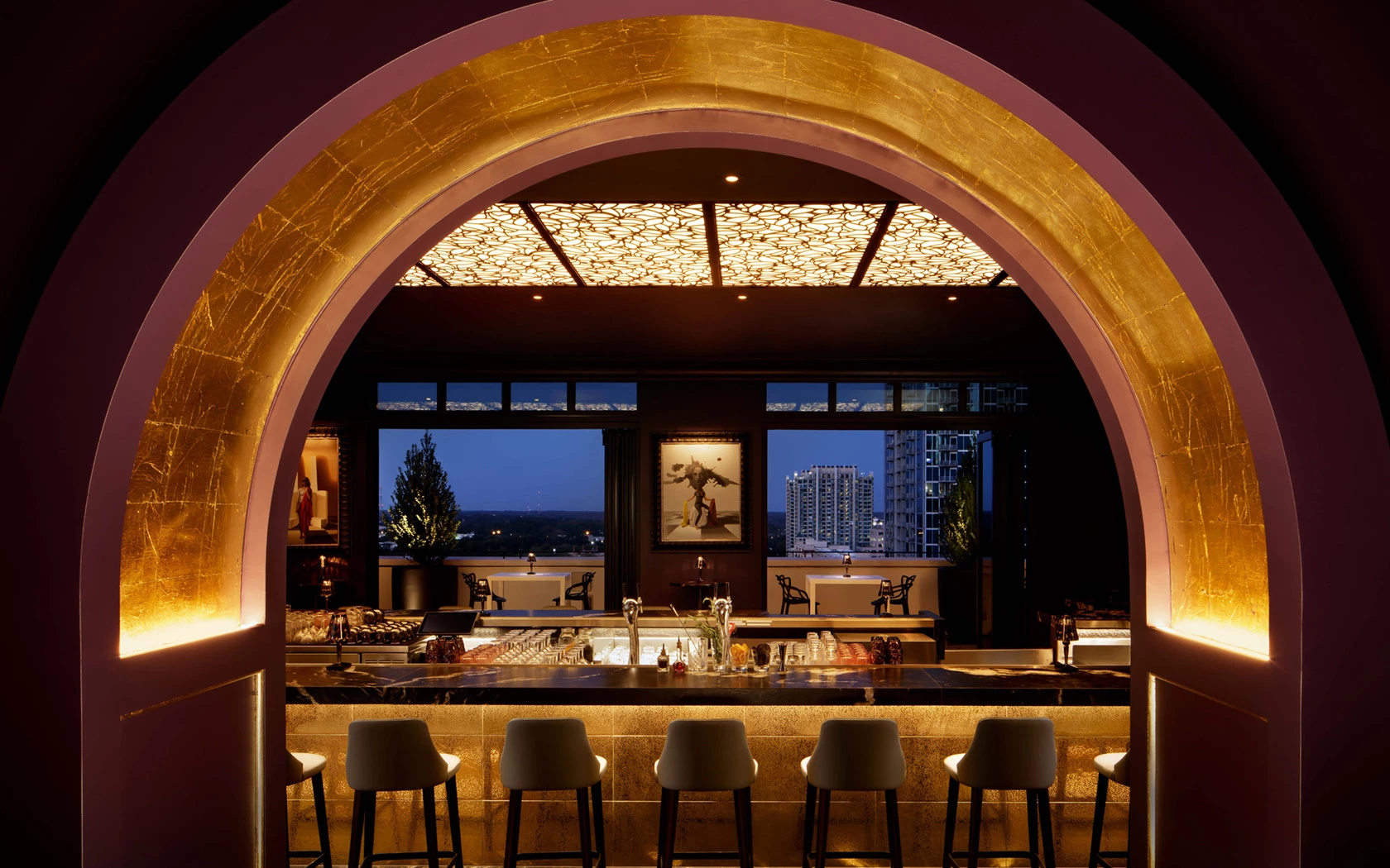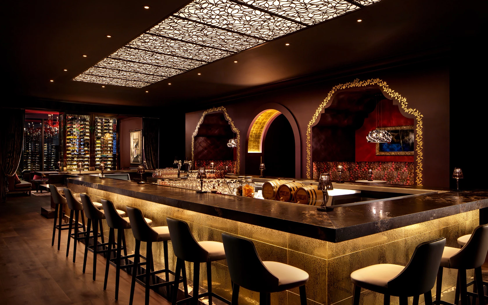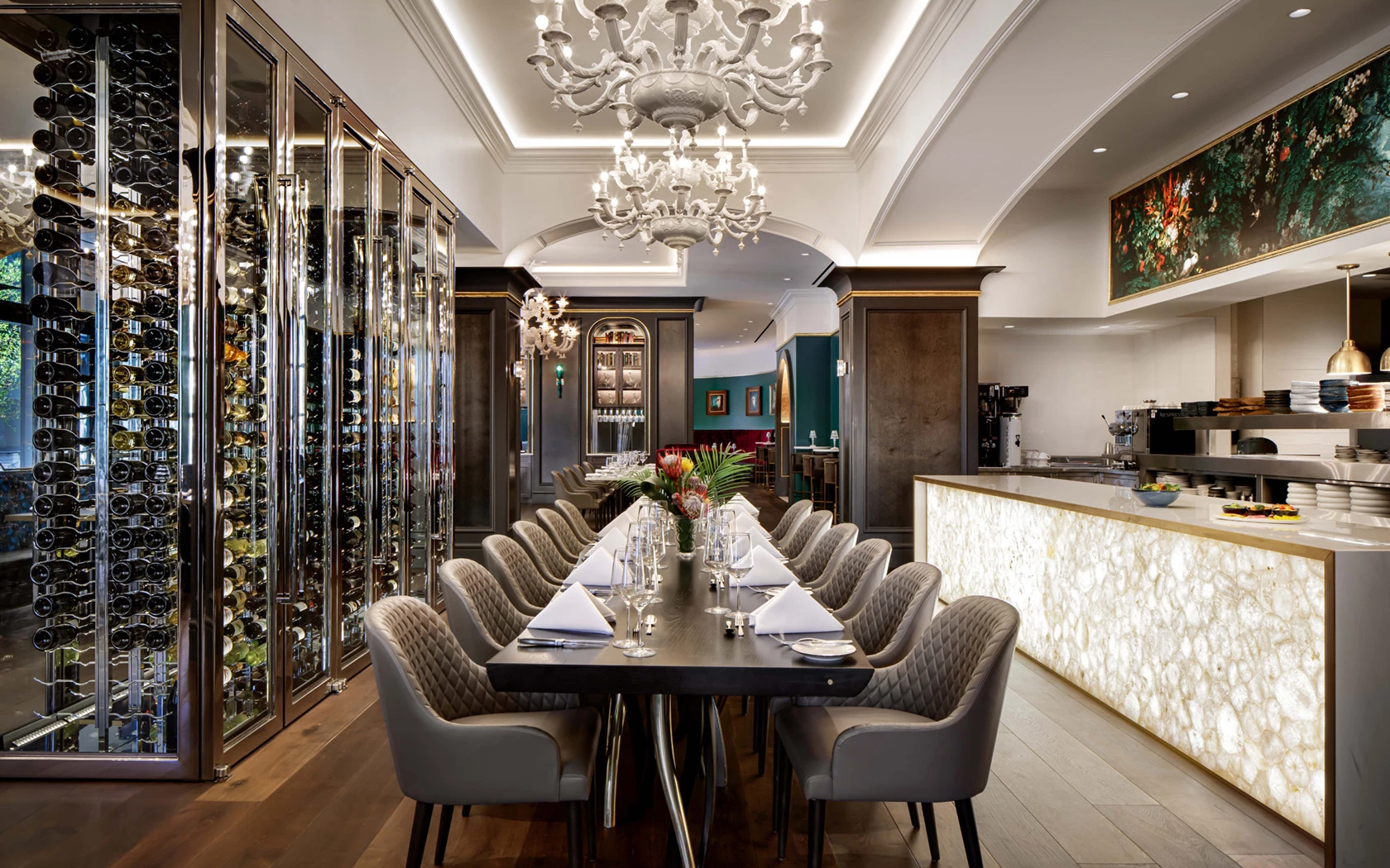 Colorful, artsy, and modern aesthetic wine room and dining area.