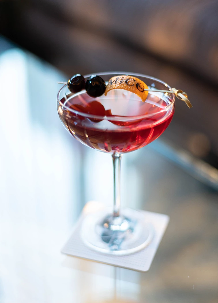 Red velvet booths, dark gray velvet chairs in a private dining area.