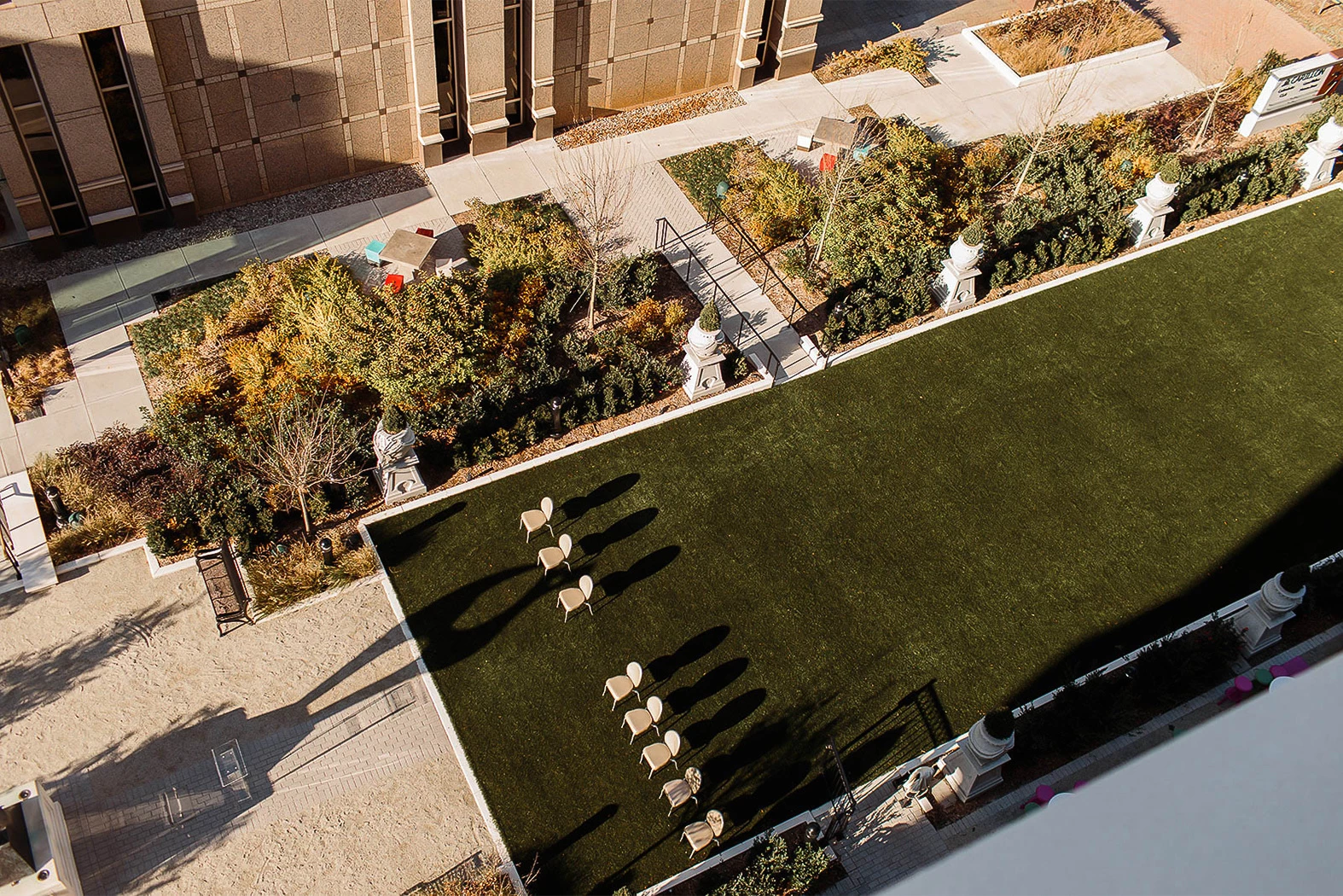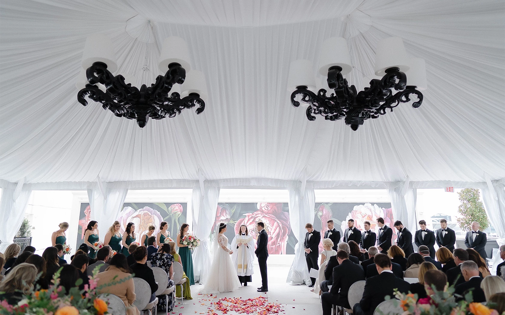 Chandelier, black chairs and tables, flowers and floral designed art wall private dining area for wedding reception.