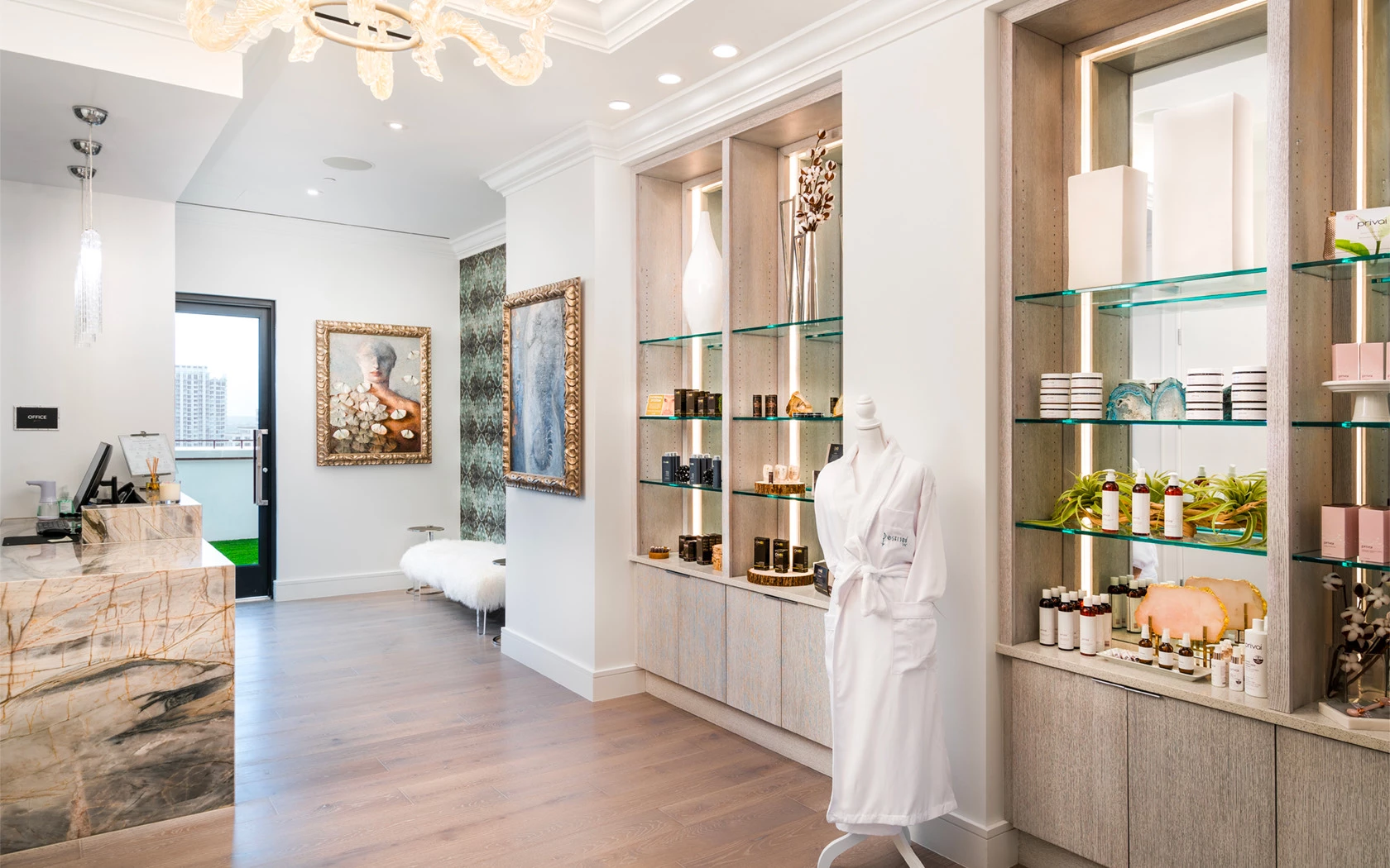 White and black pattern marbled floor, with red and black interior decoration venue entrance.